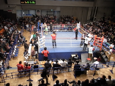 ラウンド終盤パンチで相手を下がらせたのは遠藤選手。