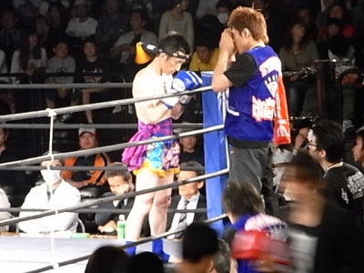 試合終了と同時に両選手が肩を組んで拳を突き出しリングを一周したのを